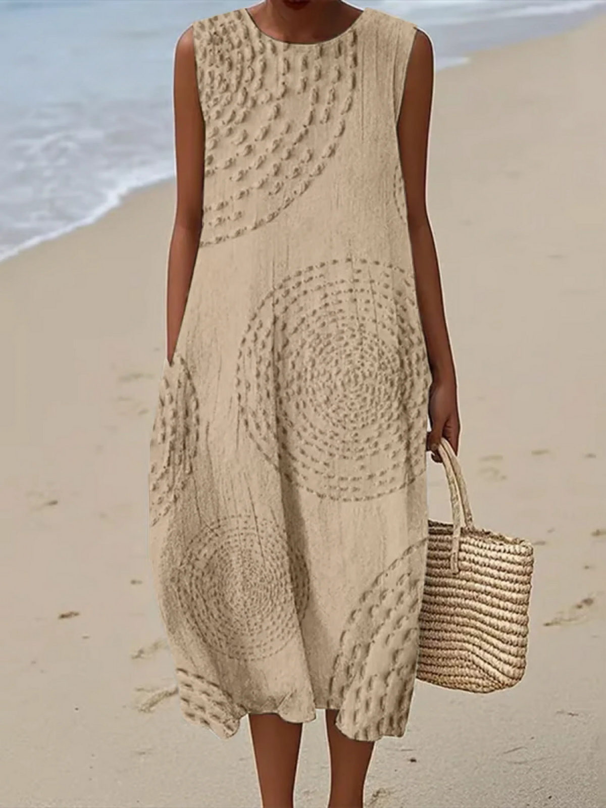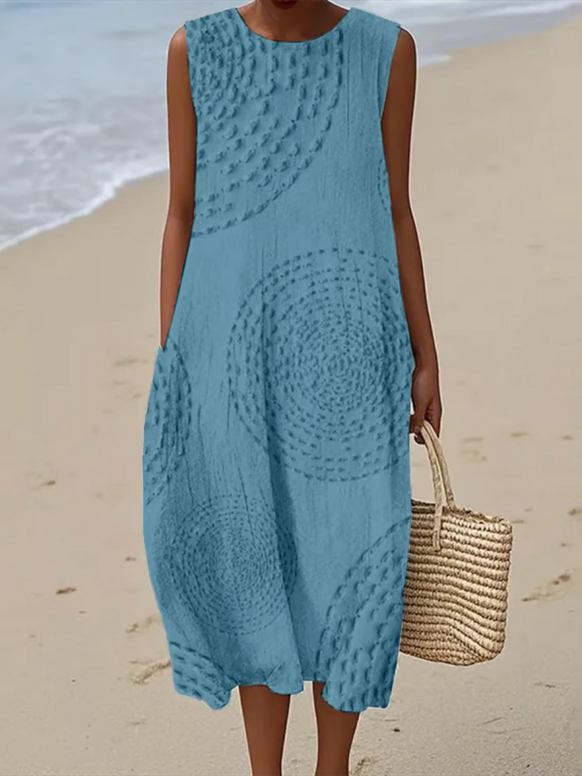 Crafted from airy, breathable fabric, this sleeveless spring dress offers a fresh take on everyday elegance. Designed to keep you comfortable as temperatures rise, it flows effortlessly while maintaining a clean, refined silhouette. Easy to dress up with sandals or keep casual with flats, it transitions seamlessly from daytime to evening wear.